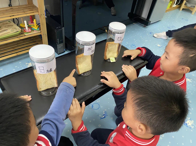 “我发现,没有密封的罐子里面的面包,长了好多绿色的点点,已经发霉了。常温下密封的面包也长了一点点绿色的斑点,只有加了干燥剂和放在冰箱里面的面包还没有发霉。”