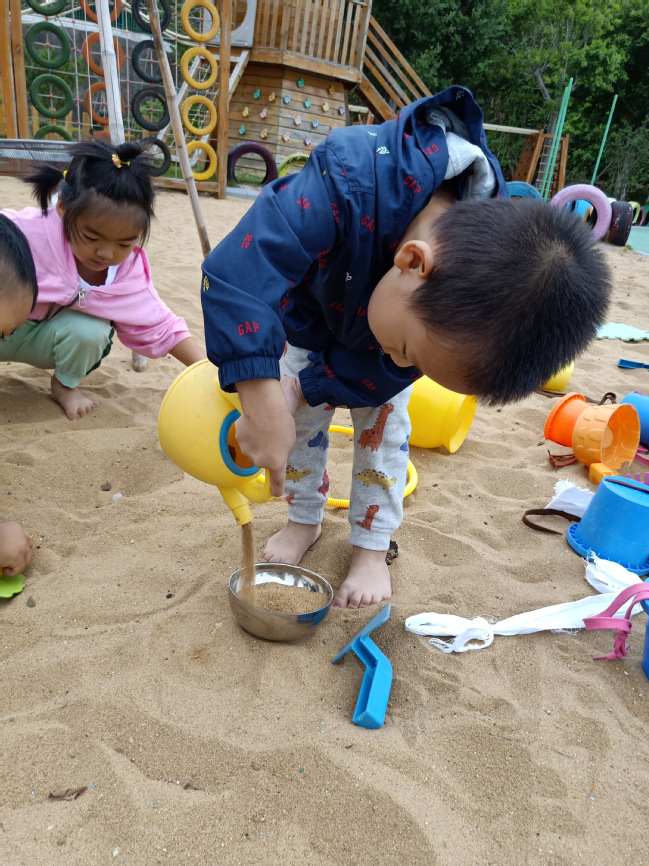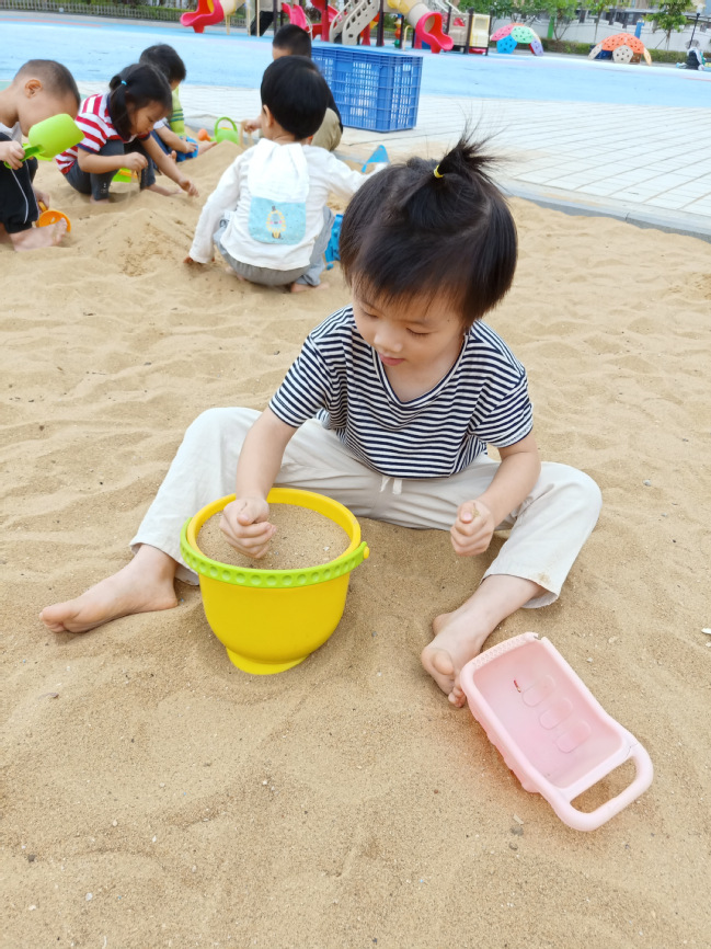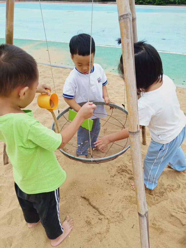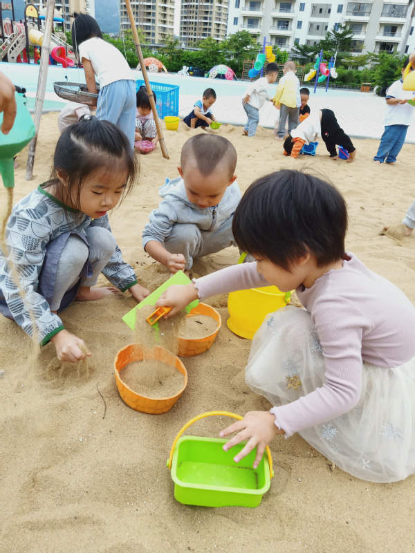在游戏中,他们一起装沙子,体验团结协作的快乐。他们用自己喜欢的方法去玩,感受到自我控制的乐趣,心情就变得很愉快。
