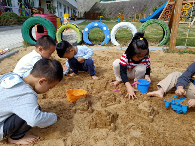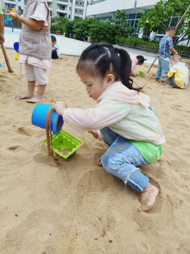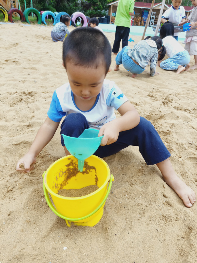 幼儿通过铲沙子,对桶与沙子之间的关系有初步的理解,尤其是把装满沙子的城堡容器倒扣过来,出现了城堡的造型,促进了幼儿对空间关系的认知。用沙子做“装入倒出”的游戏,增添了游戏的乐趣,小小的沙子实在是太好玩了!
