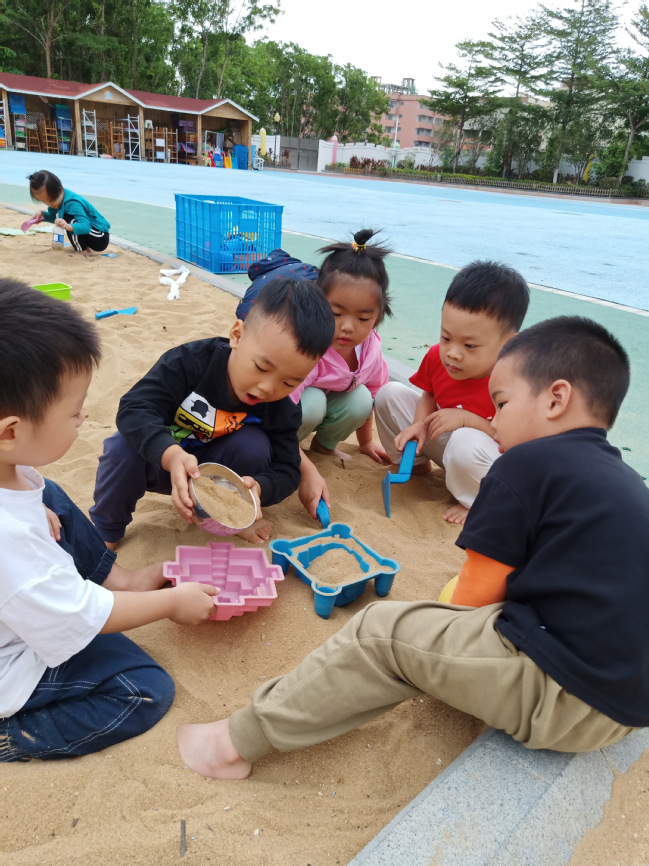 沙子有流动性,当抓起一把沙子时,沙粒会从指缝中流动,给幼儿一种很特别的感受,发展了幼儿的感知觉。