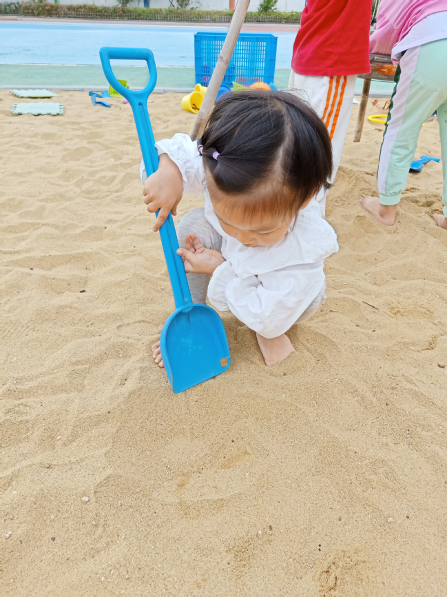 幼儿在无拘无束、自由自在地玩沙时,心情会豁然开朗,在玩沙的时候,幼儿用铲子将沙子铲起来,这个动作发展了孩子的手腕精细动作,锻炼了肢体协调的能力,不仅促进了身体的发展,还促进了大脑的发展。