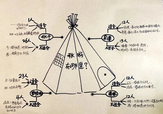 孩子们对秋游有了自己的理解和想法,带着你知道什么是秋游吗?园内秋游VS园外秋游?针对秋游的地点,开始激烈的PK;秋游日你最想玩什么?带着帐篷秋游好玩吗?又针对帐篷的数量以及如何搭建有了新的思考。