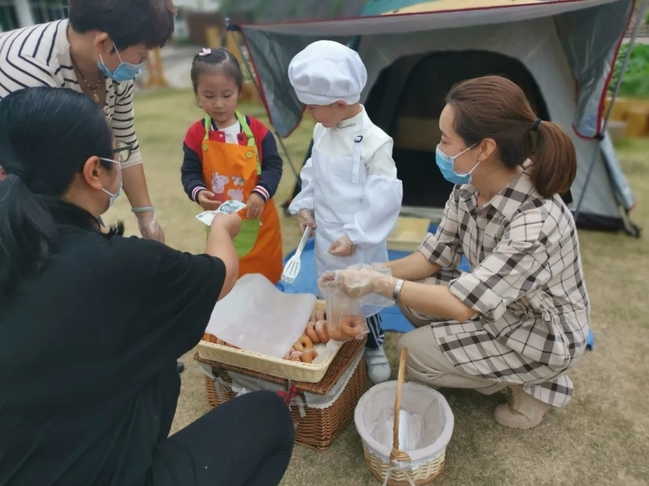 在美丽的“嘉”园里发现蚂蚁;透过“显微镜”下发现了小昆虫。在小蜜蜂”农场拓展创意石头记;帐篷实况记录每个环节。邀请面点老师制作《魔法森林甜甜圈》;《甜品坊》售卖现场交流与对话。当教师介绍各种烘焙食材时,孩子们在学习语言和词汇,当孩子接触各种不同的食材时,他们在探究,探究所到之处充满兴趣、独立、动手、反思和分享,自己动手做美食的愿望得以满足,孩子们得以尽情的体验、探索、感知和创造。