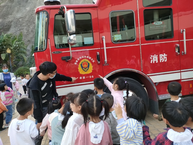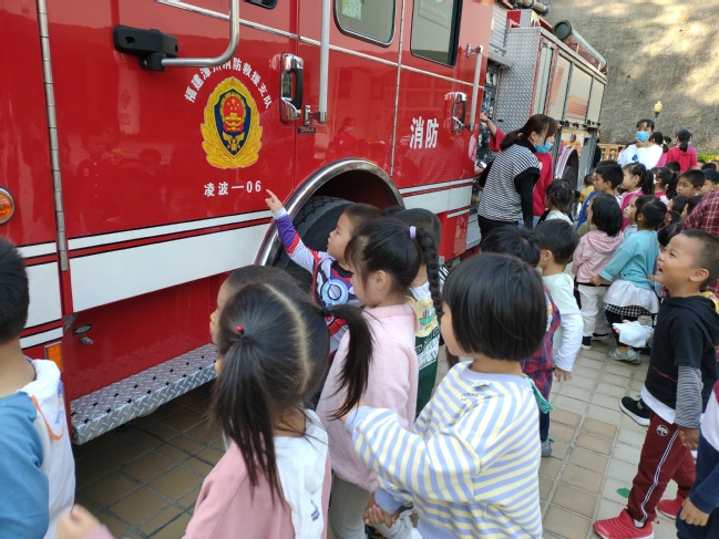 最后,老师带幼儿一起去参观了消防车,近距离地认识消防车结构与功能,知道了它的很多大本领呢!