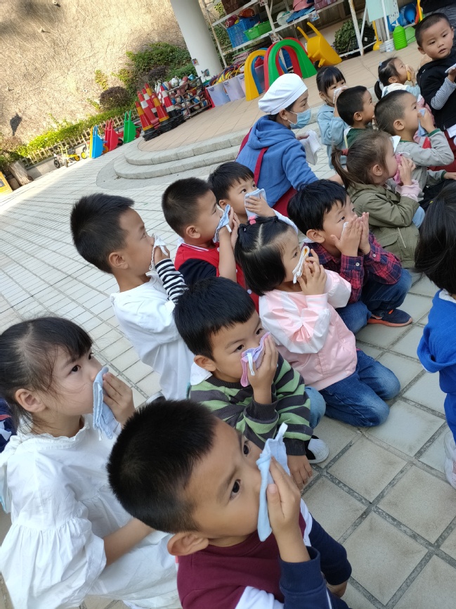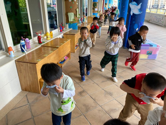 随着紧急的警报声响起 师生消防疏散演练活动开始了。幼儿拿着一块小方巾打湿、捂住口鼻,找到最近的安全出口,弯腰靠墙走。