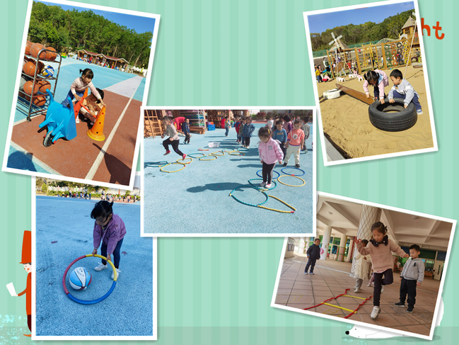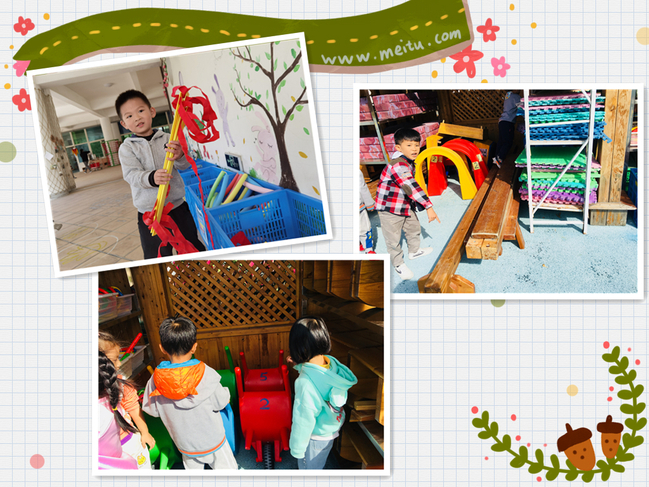 在制定好方案之后,孩子们选择了平日里常用到的户外器械,也找到了一些玩法单一的材料,通过和小伙伴们讨论,还想出了许多不一样的有趣玩法!他们在一次又一次的预摆过程中完善游戏,直到每一个游戏项目都能够顺利开展。