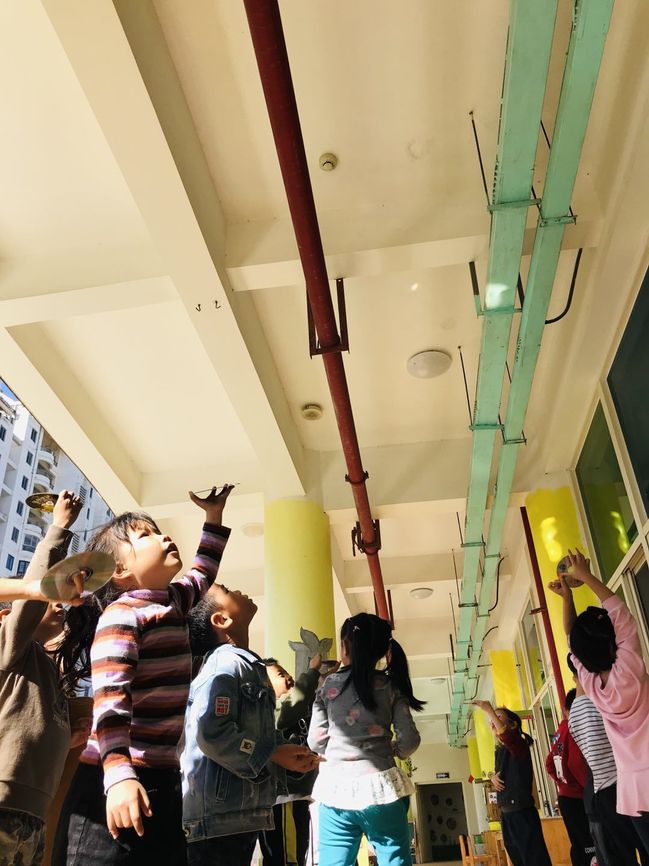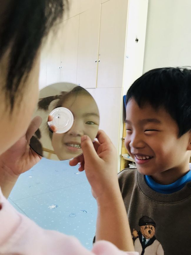 点心后的课间活动,孩子们在睡房、在走廊、在大厅、在操场都找到了各种各样的光,他们利用光盘、水、镜子等物品一起寻找到了生活中看到的光。