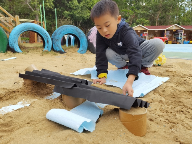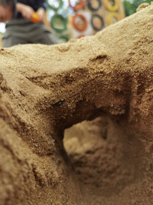 “我知道,是桥,弯弯的。”上次的沙上建构,俊霖将两个洞打通了,于是一座桥诞生了。