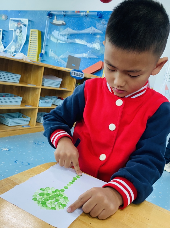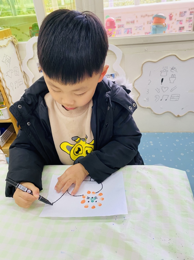 又到了快乐区域活动时间,美术区的几位小朋友用自己的小手指,蘸上喜欢的颜料,经过简单的添画变成了有趣的造型,是不是很有趣呢。梓敬用绿色的指纹印出了什么?原来是一颗大树呀!子涵:“老师,你看我的手指印出来一个小狮子的脸”,他用笔画上了小狮子的身体和尾巴,真是太神奇了!