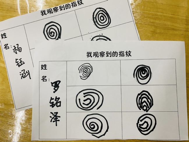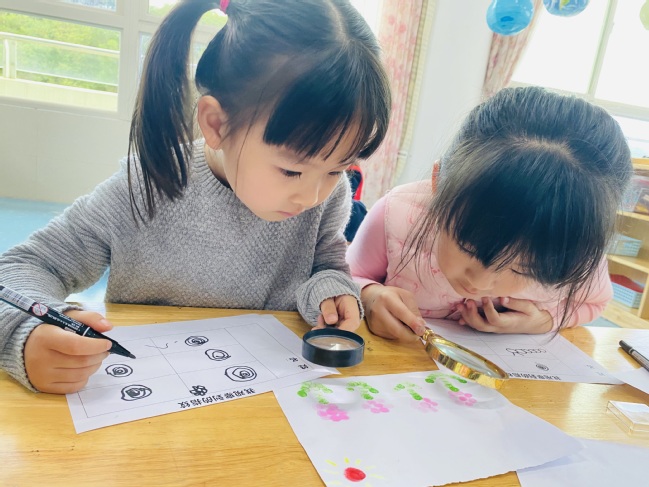 原来在我们的手指上,隐藏着一个小秘密,让我们一起去发现它吧!小朋友们对自己的小手再熟悉不过了,可是从没有认真的了解过小手上的指纹。他们认真的观察印画中的指纹并发现自己手指的秘密。紫熙和可菲也拿起来放大镜看刘欣用指纹印的小花,小朋友们纷纷拿起小伙伴们的指纹印画仔细观察着并认真地记录着小伙伴们的指纹纹样,原来指纹对于每一个人来说都是独一无二的,每个人的指纹各不相同,它还可以帮助警察叔叔破案呢。它是我们身上特有的记号哦!