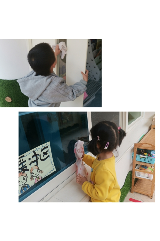 既然如此,心动不如行动,看看我们小3班的小朋友们都是怎么做的吧!孩子们自发拿起水壶、水盆、给幼儿园里的花草浇水;拿起扫把、抹布帮助老师把活动场地、班级门窗、板凳清洁得干干净净。