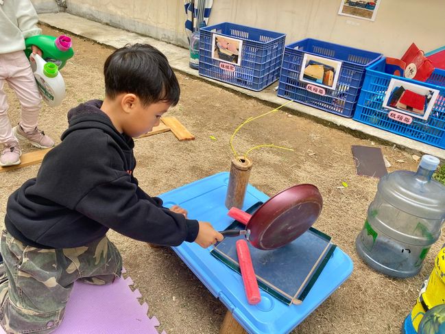 又到了中庭自主游戏时间,蓝梓洋小朋友从一个小框里捡起了两跟红色的圆形小泡沫管,此时在他身边的朱语燕小朋友说:“哇,蓝梓洋,你居然拿了两根红色的大香肠,我们一起把这两根大香肠炒一炒,当我们的午饭吧!”,蓝梓洋很开心:“可以呀,我再去买点‘青菜’(塑料叶子)!”于是几个小朋友一起如火如荼搭灶台,搭餐桌,分工明确。有的小朋友还去拿“竹筒”准备当柴火进行烧柴。这时我问了拿着“柴火”准备生火的钟芊洵:“你在做什么呢?”芊洵回答:“我在烧火呀,这个灶台火太小了,我要加点木柴火炭进去,让香肠快点煮熟,我外婆家的灶台就经常烧火炭,做菜可香了。”这时,蓝梓洋小朋友说:“哎呀,没有酱油了,谁快去买点酱油。”很快,朱语燕跑到旁边区域的“超市”里,买了酱油回来,并对蓝梓洋说了一句:“香肠没炒糊了吧,我跑的可快了。”蓝梓洋很开心的说:“你来的刚刚好,我酱油再滴一点下去,香肠就会很美味哦!”没过多久,香肠炒好了,蓝梓洋找了一块“盘子”装着刚炒好的香肠,大家很开心的坐在“餐桌”上吃着美味的“炒香肠”。蓝梓洋突然说:“你们发现了吗,好像味道淡了一点,我好像忘记放盐了。”朱语燕马上说:“我妈说了,还可以放点胡椒粉会更好吃的!”于是,他们又在香肠里放了“盐”和“胡椒粉”,还邀请了刚刚从别的区域跑过来围观的陈伊诺小朋友一起品尝美味的香肠,分享完美味后,他们各司其职,洗碗洗锅,有序进行中......