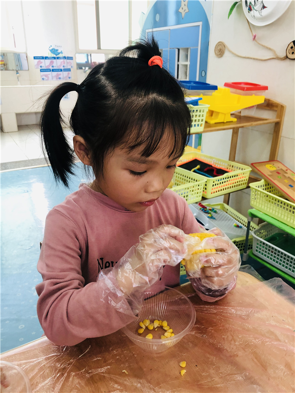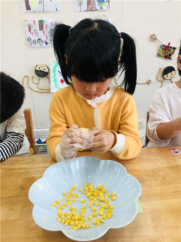 “一个个完整的玉米棒,剥剥剥,剥出好多的玉米粒呀!”