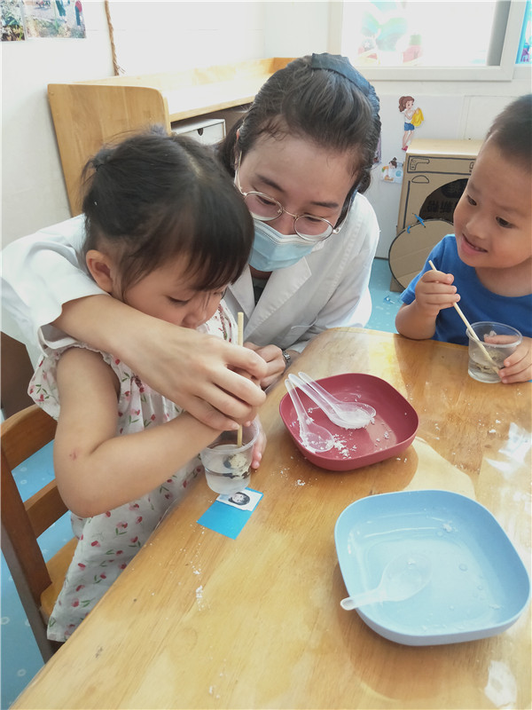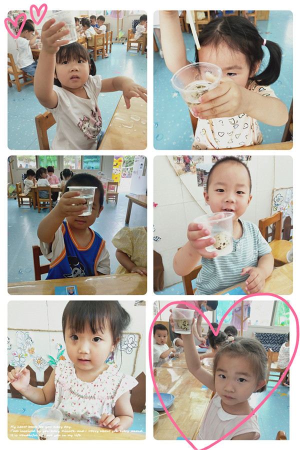 泽韵妈妈带着孩子们亲身投入实验《鹌鹑蛋浮起来》,通过水、盐、鹌鹑蛋三种简单的操作材料,让孩子们进行探索、尝试,孩子们小心翼翼保护着蛋宝宝、轻轻搅拌、慢慢感受蛋宝宝在水里的变化。