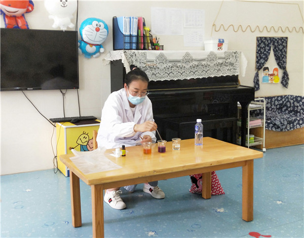 炜彤妈妈为孩子们展示了《颜色变变变》的小实验,孩子们看得目不转睛,感受到了颜色不见了的神奇。