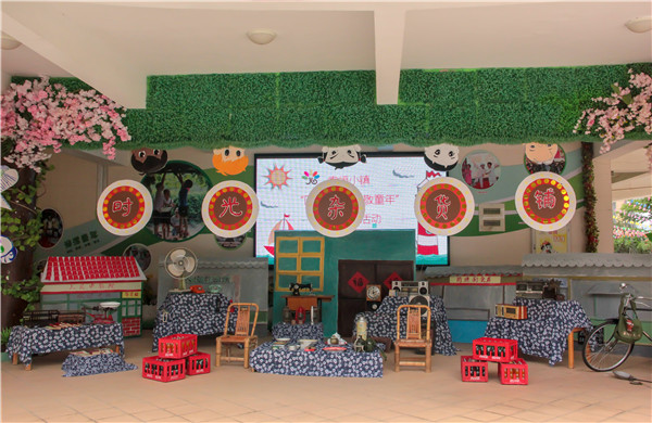 此次活动以 “走近老物件”、“国产动画片”、“四大名著”、“经典游戏”、“儿时味道”等80年代大家熟知、热爱的动画、著作、游戏等为切入,创设有24个游戏体验区域,供孩子自由选择。所开放的区域包含草船借箭、蹴鞠、过五关斩六将等多个体育游戏区域;玩转名画、李氏裁缝铺、照相馆、卡拉OK、跳舞毯、大观园茶艺、花艺等手工艺术表现区域;四驱兄弟、耍花腔、26款经典游戏、寻找蛛丝马迹的黑猫警长等经典游戏体验区域;武松打虎、偷吃人参果、四大名著皮影戏等故事、童话剧表演区域;以及冰套葫芦、老冰棍、红楼梦美味糕点、武大郎烧饼等诸多可口美食供孩子畅饮畅食。一楼厅堂粮票、老式电话、风扇、凤凰牌自行车等老物件的观赏区域更是引得孩子、老师们频频驻足。