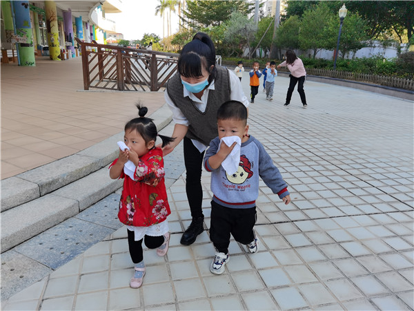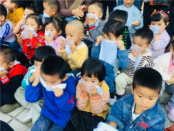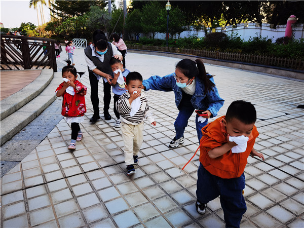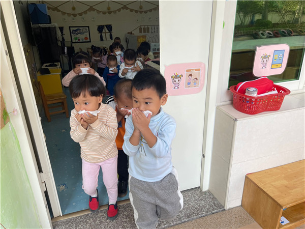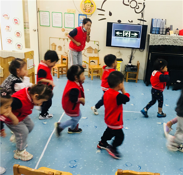 上课时,突然警笛响起来,“快!小朋友们拿起你们手上的湿毛巾捂住口鼻,跟我走!”老师一声令下,萌娃们跟着老师按紧急预案的疏散路线捂住口鼻,弯腰小步快走,安全有序地疏散到安全地带。