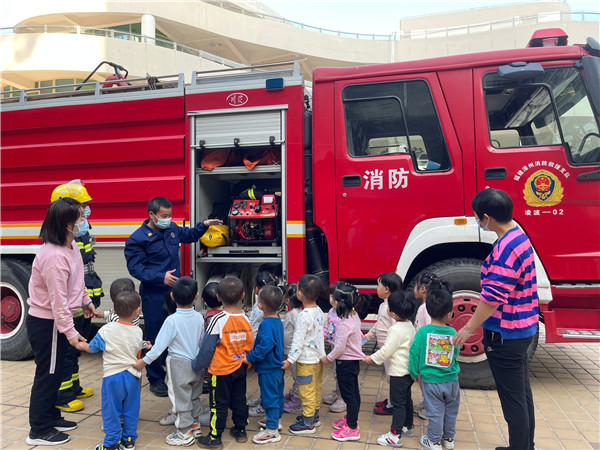 瞧!停放在操场上的“庞然大物”——一辆红色消防车瞬间引起了孩子们的注意,演练结束后,在教师的带领下孩子们迫不及待地走近消防车,他们围着消防车这看看、那摸摸,充满了好奇和兴趣。消防救援大队的叔叔用浅显的语言为小朋友讲解消防工具的使用方法,还介绍了许多消防车上的小秘密,孩子们兴奋不已,不停地欢呼鼓掌。