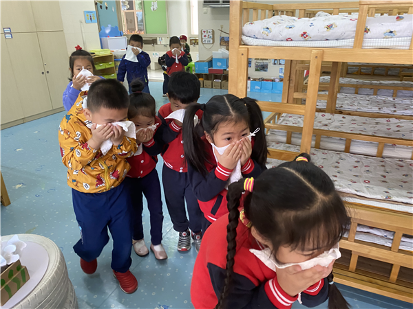 随着一声警报声响起,原来是“着火了”。小朋友们在老师的带领下用湿毛巾捂住口鼻,弓着腰,排队到操场集合,有序的逃离“火灾现场”,安全疏散到小操场。整个过程组织严密,动作迅速。