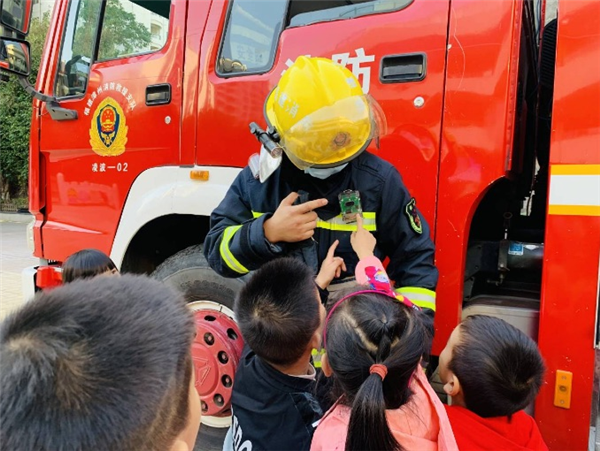 发生什么事呢?原来今天是“119”,是中国的消防日。小朋友们正在开展消防安全演练活动。