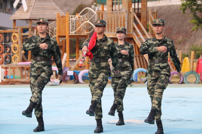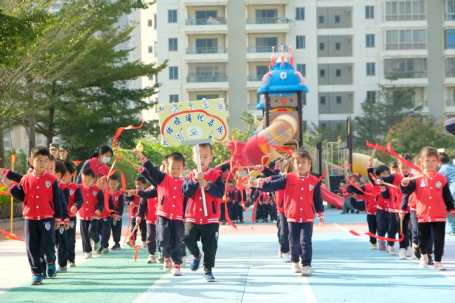 伴随着那刚劲有力的《运动员进行曲》和主持老师充满激情的解说词,小小运动员们穿着整齐的园服,迈着自信的步伐,雄赳赳气昂昂地进入运动场地,一二一,一二一,大声喊出他们的口号!“嘉”里的大学生哥哥姐姐则迈着稳健的步伐,高举着鲜艳的五星红旗向我们走来。面向冉冉升起的五星红旗,老师和小运动员们行注目礼,这一刻,相信每个孩子心中都为自己是中国人而骄傲自豪。