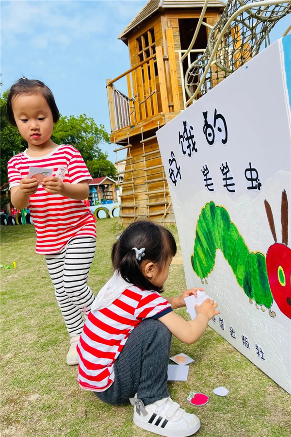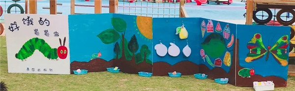 阅读的时候如果遇到有趣的情节,不妨加入其中,和绘本一起“玩游戏”吧! 《好饿的毛毛虫》绘本游戏:找到的“食物”贴在“毛毛虫”展板上,看谁贴得最多吧!
