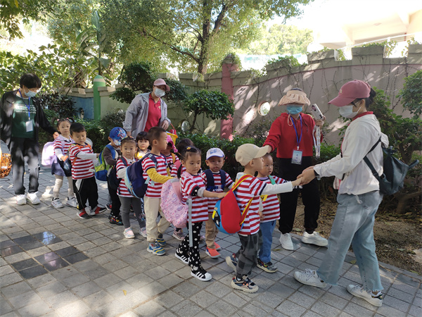 “走走走走走,我们小手拉小手,走走走走走,一同去郊游……”在老师的带领下,我们伴随着歌声从幼儿园出发,沿着人行道前往南区操场。一路感受着金秋的景色,沐浴着秋风从小朋友稚嫩的脸庞拂过!