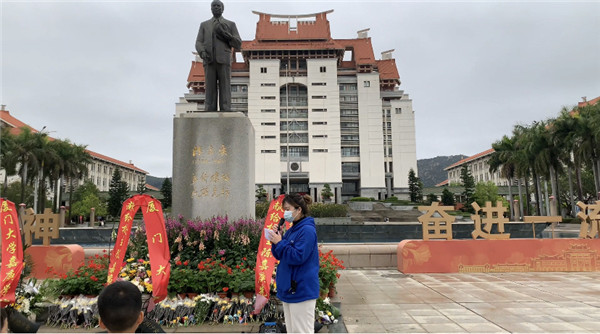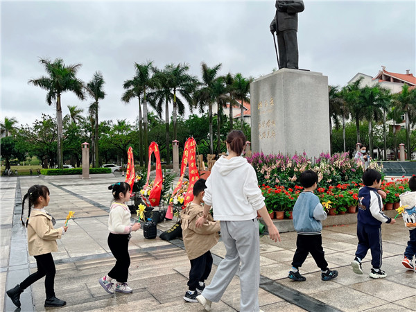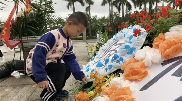 祭扫仪式上,幼儿园中班全体师生首先向陈嘉庚爷爷铜像深深三鞠躬。随后,幼儿代表向校主陈嘉庚先生铜像敬献花环。参加活动的全体师生还依次向陈嘉庚先生铜像敬献自制的小花。