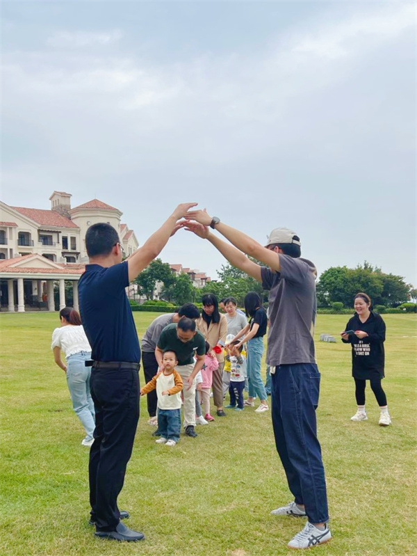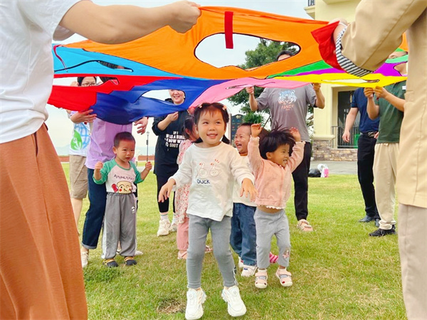 三位老师许老师,郭老师,林老师带领孩子和家长搭起了火车,伴随着欢快的音乐节奏,火车钻过由家长搭起的隧道,大家在互动中体验到了游戏的乐趣,消除了一开始的陌生感。紧接着老师切换音乐,带着大家开始做暖身操,全场小手大手一起舞蹈,好不热闹。伴随着“小老鼠上灯台,偷油吃下不来……”的音乐响起,打地鼠的游戏开始了。相比一开始的羞怯,此时的小朋友们都放开了许多,一个个化身偷吃油的小老鼠,在彩虹降落伞下蹦蹦跳跳,悦耳的笑声像银铃般响个不停。不一会儿,郭老师便披上了彩虹斗篷,化身老鹰来抓小鸡们啦。“快跑呀!老鹰来啦!”小鸡们和爸爸妈妈一边叫着一边笑着,在草地上奔跑躲藏。沐浴着海边清新的空气,孩子们就是一只只欢乐的小鸡,感受游戏与陪伴带来的欢畅与幸福。最后是小脚踩大脚的游戏,孩子双脚踩在家长的脚上,配合着向前进。