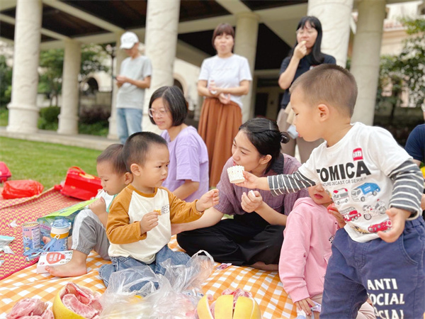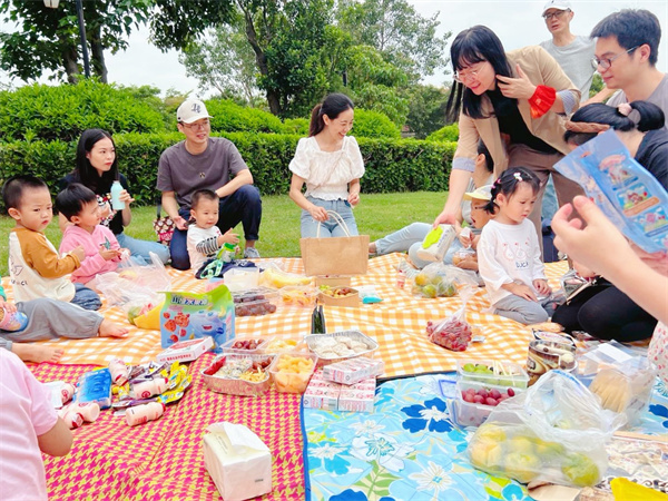 游戏过后,大家开始野餐啦。在阳光的沐浴下,一群人围坐在一起,有敬爱的老师,有友爱的小伙伴,有亲爱的爸爸妈妈。孩子们互相分享着自己喜欢的美食:“给你一个小蛋糕吧”,“谢谢,也给你吃薯条吧”,“谢谢你”。笑声伴随着爱意弥漫开来。最后,所有人面朝大海,留下合影,也定格了这场美妙的回忆。