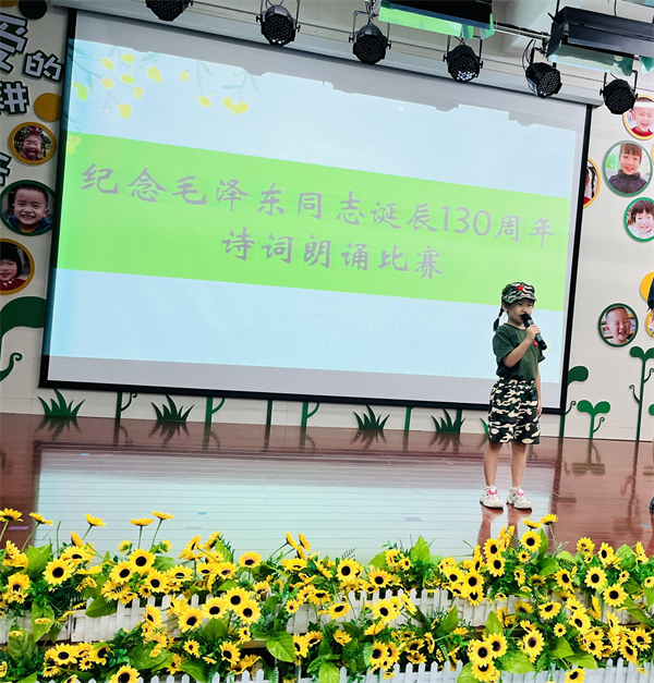 大班的小朋友和老师在“纪念毛泽东爷爷诞辰130周年诗词朗诵”展演中,以饱满的情绪、激昂标准的普通话进行了精彩的表演,充分展现自己的普通话素养和热爱领袖爷爷的激情。