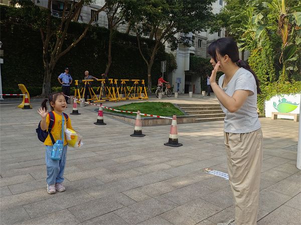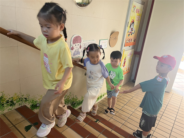 在上下楼时候,大班的小朋友遇到弟弟妹妹,他们会用文明的语言请弟弟妹妹先走,并在旁边充当保护者、人人争当“文明小标兵”。在入园、离园的时候,声声“早上好”、“再见”文明用语满溢校园,营造了良好的文明校园氛围。