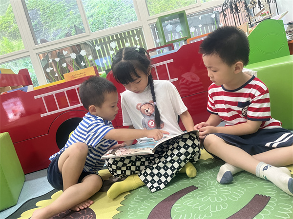 大班哥哥姐姐用流利的普通话为弟弟妹妹讲绘本,并让他们“大手牵小手”和爸爸妈妈一起行动,每个家庭都说好普通话,辐射到社区、社会。