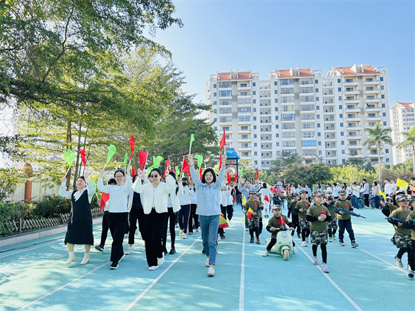 今天,幼儿园的运动场化身为荣耀的阅兵场。在激昂的进行曲中,大、中、小、托班的“小小童子军”们,身着象征各军种的特色服装,在幼儿园园标方阵带领下,目光坚定、步伐铿锵地步入赛场。各班级用富有自己班级特色的形式进行开场表演。全场师生与家长肃立行注目礼,凝视着五星红旗冉冉升起,爱国情怀在每一颗心中激荡。