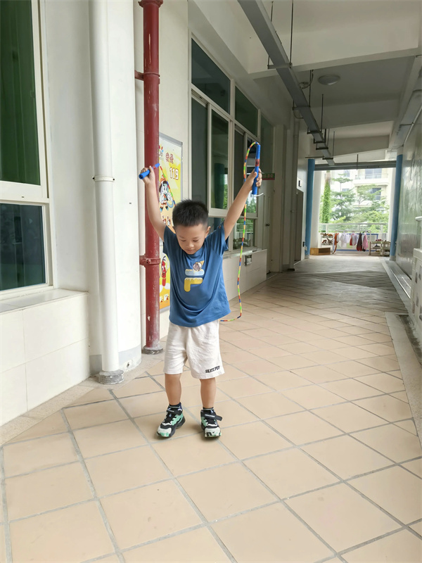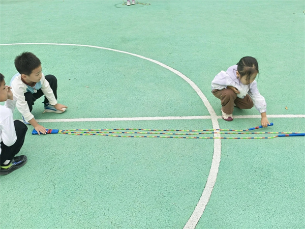 在不断的讨论与探索中孩子们发现:“绳子要握紧,不然会飞出去。”“跳的时候要轻轻跳,落地要轻。”“甩绳要用力,但不能太快。”孩子们在实践中总结经验,互相分享,成了真正的“跳绳小专家”。
