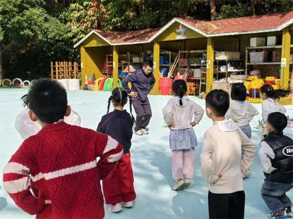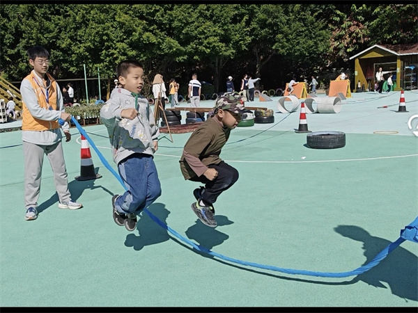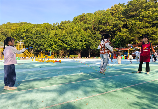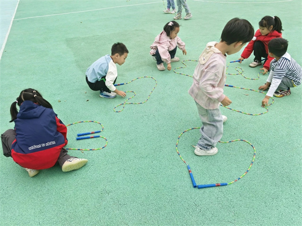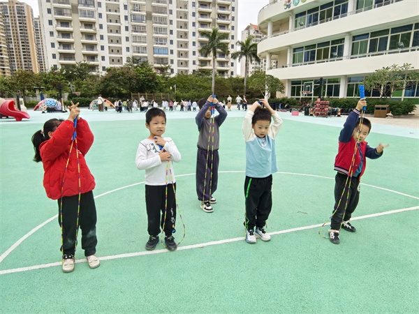 幼儿不再满足于“单人跳”,开始尝试:双人跳;交叉跳;带人跳;花样跳绳表演……操场上,绳影飞舞,笑声不断。他们用跳绳编织出属于童年的节奏与旋律。