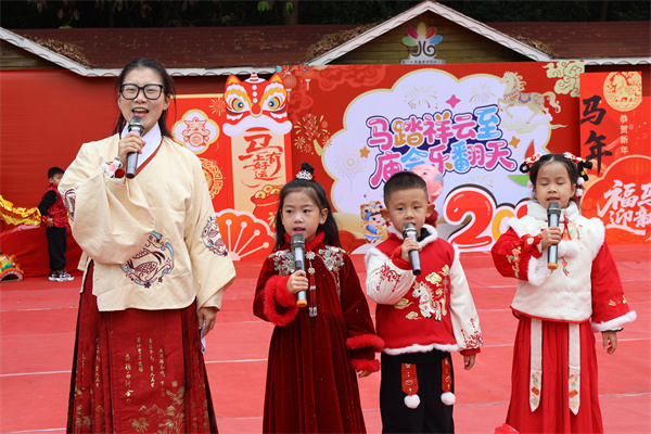 活动当天,园区内张灯结彩,喜气洋洋。家长与孩子们身着喜庆红火的新年服饰,整个幼儿园沉浸在浓郁的节日氛围中。上午8:40,欢快的音乐响起,“马到成功幸福门”前人头攒动,孩子们与家长在此打卡拍照,定格美好瞬间,随后“一马当先”开场派对准时拉开帷幕。教师组活力四射的开场舞《好运全都来》后,各段幼儿和家长带来精心准备的亲子展演,看,孩子们稚嫩的脸庞洋溢着自信与喜悦。随后园长老师发表热情洋溢的致辞,代表幼儿园衷心感谢幼儿园理事会和全体家长、以及华侨博物馆和厦门大学嘉庚学院相关院校对幼儿园本届庙会的大力支持。最后,园长和代表幼儿敲响大鼓,宣布庙会正式开始!整场开场热闹非凡,掌声与欢呼声此起彼伏。