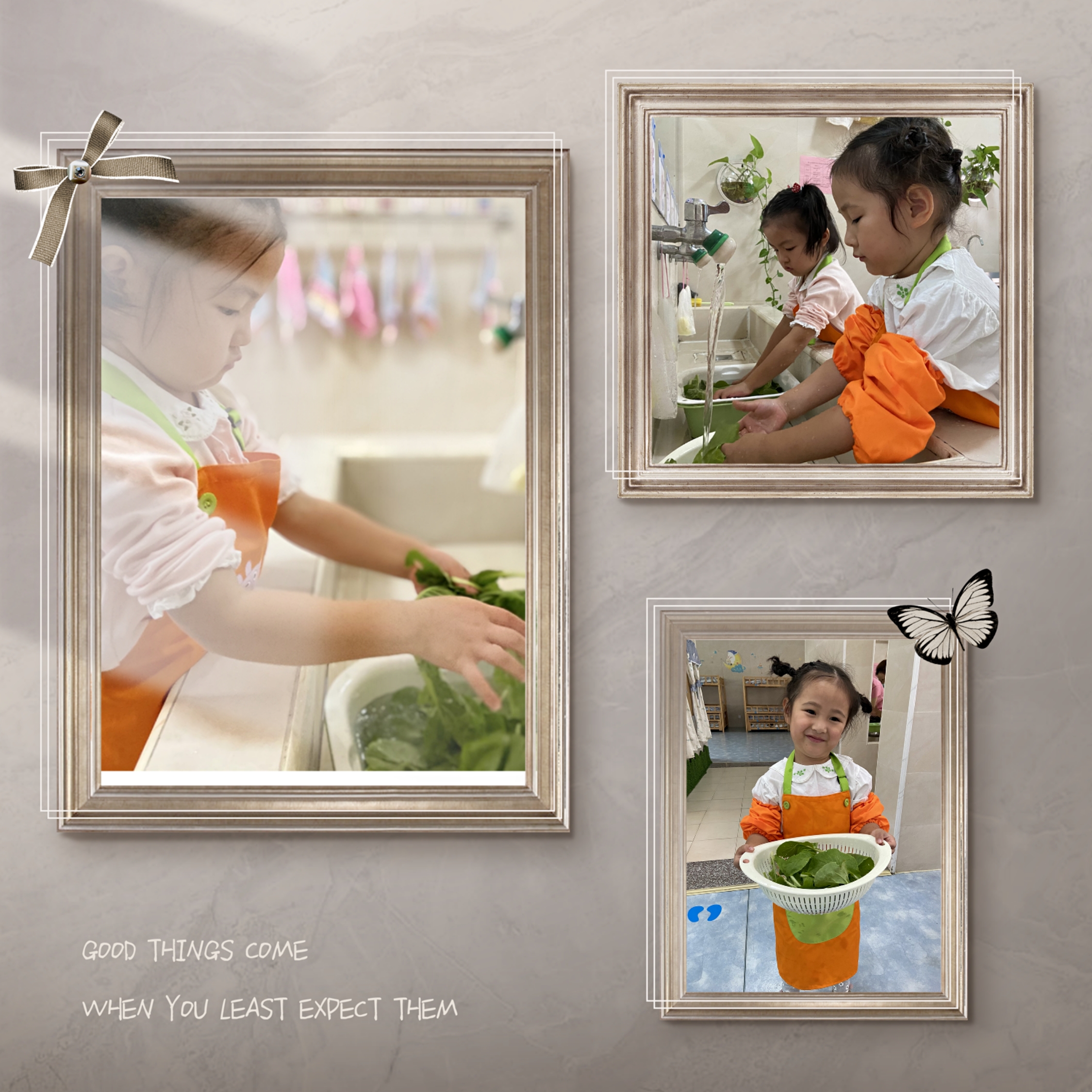 星期五的早上,小朋友们带着心中那份“期待”早早来到幼儿园,开始他们的体验之旅——农家乐。首先,来到的是小厨房的洗菜间,在老师的介绍下知道洗菜间分蔬菜清洗池,还有了解洗菜的步骤。其次,在孩子们的讨论下认识了炒菜的工具以及相关的调料品:电池炉、炒锅、铲子、食用油、儿童酱油、盐等,一切就绪。在老师的安全指引下孩子们开始享受炒菜的过程,孩子们情不自禁的跟着炒菜噼里啪啦的节奏拍起手来,欢呼着好香哦!当然也最期待的就是品尝这个环节了,从来不吃青菜的林睿渊大口大口吃起来,一大盘青菜一扫而光,王辰翰和张酉熙商讨回家也让妈妈炒这么好吃的青菜。