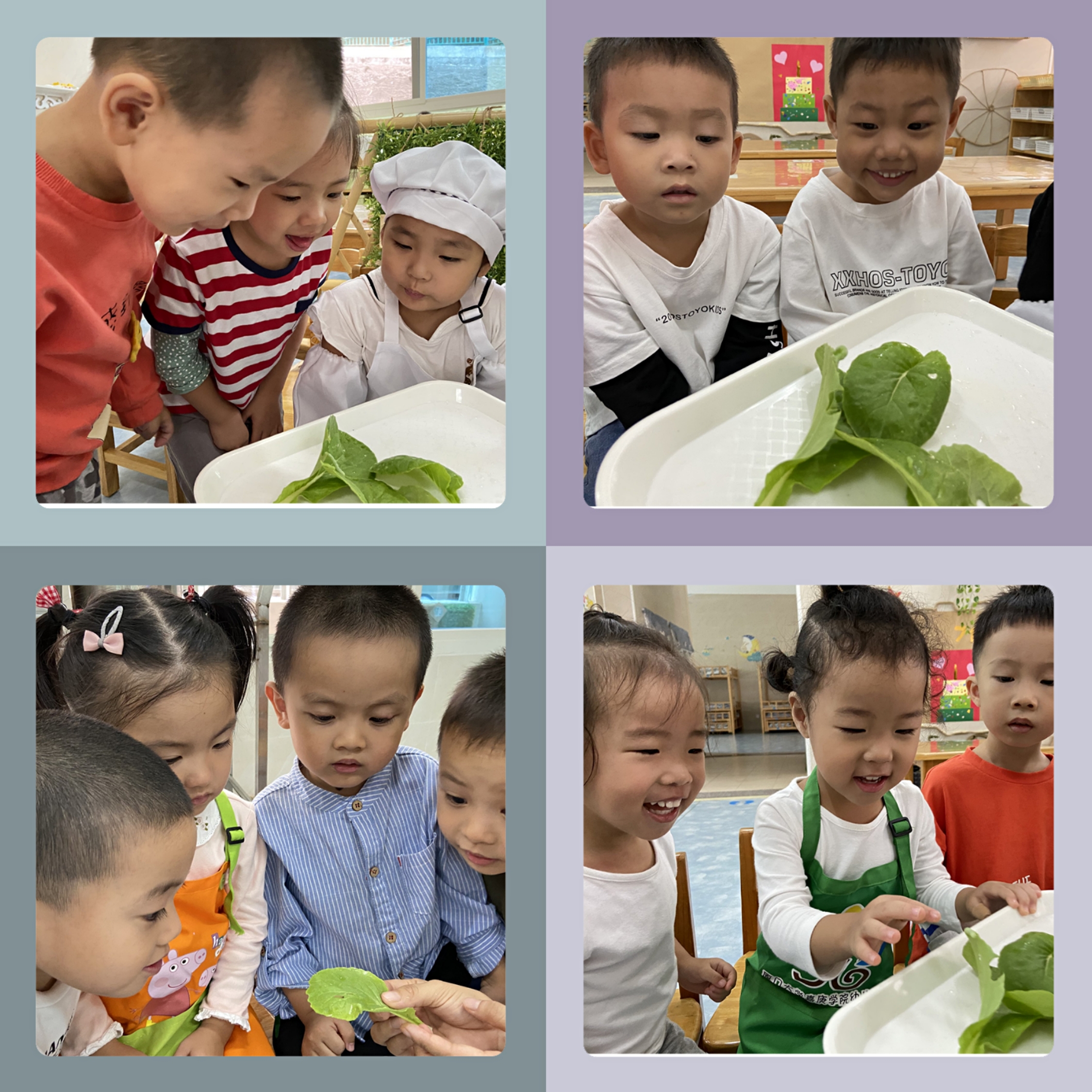 在收获的季节里,我们采摘什么部位呢?我们动手试一试,掐了掐,越往下面就掐不动了,要掐嫩嫩的头,这样的才好吃!有的发现小白菜长得不一样,有的叶子是大大的,有的叶子有一个个洞洞,在松软绿绿的叶片上寻找到小菜虫的痕迹,只听见尤好大声的喊到:“涵涵,这片菜叶上有一条大大绿绿的菜虫”,涵涵连忙走过来,轻轻的蹲下来观察,这时菜虫已经吃了一个洞探出头来,并且身体很灵敏的翻一个身躲在菜叶的底部,在尤好的建议下我们把菜虫请到了班级的“饲养区”。同时带上小白菜比一比谁的菜叶子最大,按照大小给小白菜排排队,看最大的小白菜是不是最重,称一称、比一比。